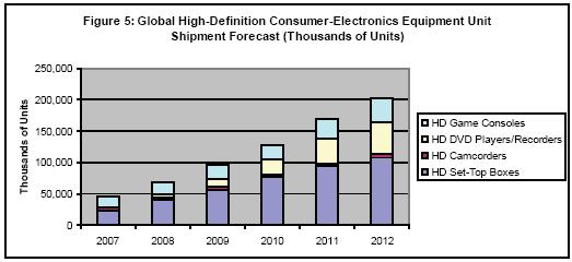 - 預計到2012年,高清晰度機頂盒、攝像機、DVD播放機和遊戲機的全球出貨量將增至2008年的三倍