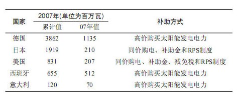在(zai)太(tai)陽(yang)能(neng)發(fa)電(dian)上(shang)領(ling)先(xian)的(de)歐(ou)洲(zhou),主(zhu)要(yao)采(cai)用(yong)電(dian)力(li)公(gong)司(si)以(yi)高(gao)於(yu)普(pu)通(tong)電(dian)力(li)的(de)價(jia)格(ge)購(gou)買(mai)太(tai)陽(yang)能(neng)發(fa)電(dian)係(xi)統(tong)所(suo)發(fa)的(de)電(dian)力(li)。而(er)美(mei)國(guo)和(he)日(ri)本(ben)則(ze)采(cai)用(yong)與(yu)普(pu)通(tong)電(dian)力(li)相(xiang)同(tong)的(de)價(jia)格(ge)購(gou)買(mai)太(tai)陽(yang)能(neng)發(fa)電(dian)係(xi)統(tong)所(suo)發(fa)的(de)電(dian)力(li)。美(mei)、日還補助用戶購置太陽能發電係統。下表列出了幾個先進國家的太陽能發電的發電量(單位為百萬瓦)和補助措施。