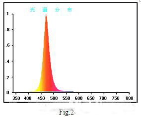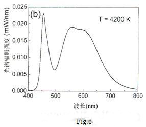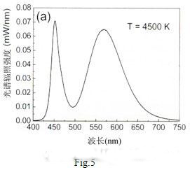 以InGaN藍光LED和1號熒光粉製成的白光LED的發射光譜示如Fig.6,其光效為55lm/W,色溫4500K。這是本人所知道白光LED的最高光效報導(據測試國內1W白光LED的光通量大多在40lm以下)。采用2號和3號混合熒光粉試製的白光LED的發射光譜示如Fig.7,其顯色指數提高到82,色溫4200K,但光效確降低到20lm/W。