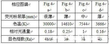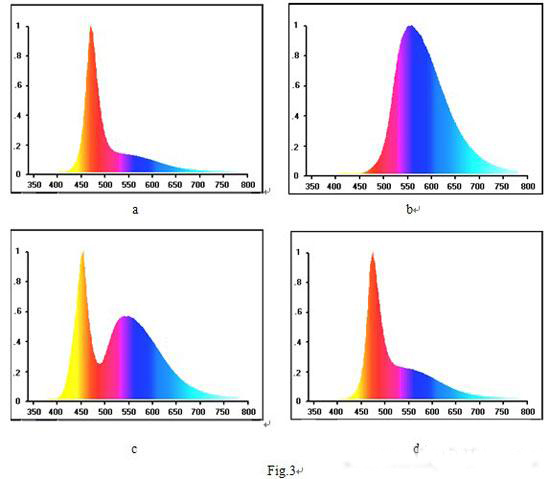 我們曾對此進行了實驗研究,我們利用某公司生產的1W高亮度藍光LED,其光譜的中心輻射波長為470nm見Fig.3,去除外封裝後分別塗敷不同厚度的輻射的中心波長為560nm的黃光熒光粉塗層,經處理後測量其發射光譜。從二十餘種不同厚度的樣品中選擇了四種典型情況,其結果見Fig