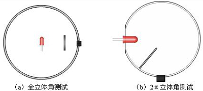 有you兩liang種zhong方fang法fa可ke以yi用yong於yu光guang通tong量liang的de測ce試shi,積ji分fen球qiu法fa和he變bian角jiao光guang度du計ji法fa。變bian角jiao光guang度du計ji法fa是shi測ce試shi光guang通tong量liang的de最zui精jing確que的de方fang法fa,但dan是shi由you於yu其qi耗hao時shi較jiao長chang,所suo以yi一yi般ban采cai用yong積ji分fen球qiu法fa測ce試shi光guang通tong量liang。如ru圖tu2所示,現有的積分球法測LED光通量中有兩種測試結構,一種是將被測LED放置在球心,另外一種是放在球壁。