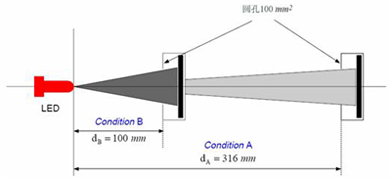 如圖4所示,點光源光強在空間各方向均勻分布,在不同距離處用不同接收孔徑的探測器接收得到的測試結果都不會改變,但是LED由於其光強分布的不一致使得測試結果隨測試距離和探測器孔徑變化。因此,CIE-127提出了兩種推薦測試條件使得各LED在同一條件下進行光強測試與評價,目前CIE-127條件已經被各LED製造商和檢測機構引用。