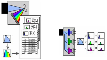 LED的顏色特性主要包括色品坐標、主波長、色純度、色溫及顯色性等,LED的顏色特性對白光LED尤為重要。 現有的顏色特性測試方法有分光光度法和積分法。如圖7所示:分光光度法是通過單色儀分光測得LED光譜功率分布,之後利用色度加權函數積分獲得對應色度參數;積分法是利用特定濾色片配合光電探測器直接測得色度參數;分光光度法的準確性要大大高於積分法。