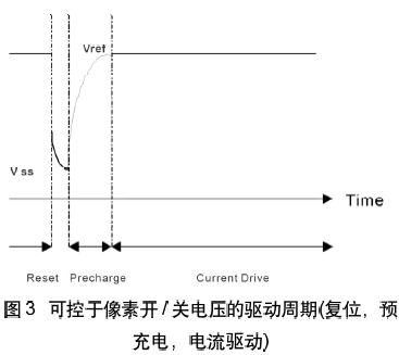 PMOLED彩色顯示要求的驅動機理和信號互換係統非常複雜。SSD1338的驅動器采用複用的尋址算法,每個驅動周期由放電(複位),電壓預充電和電流驅動三個階段組成(如圖3所示)。