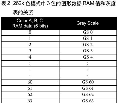 這一單一的灰度表適用於三子色,脈寬的數值由軟件指令輸入。在262k模式,每一顏色包含6-bit,因在262k模式,每一顏色包含6-bit,因此每一顏色都有64階灰度(如表2所示)。
