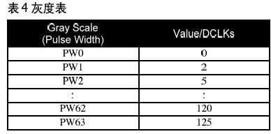 全彩顯示對每一個RGB原色分量提供6-bit,即64級灰度,通過電流驅動階段列驅動的脈寬調製(PWM)設置不同的灰度級。灰度表即為存儲了對應64級灰度(GS0~GS63)的PWM(PW0~PW63)的值。脈寬越寬,象素顯示越亮。因此,每個象素的顯示亮度由灰度表中的脈寬值決定。