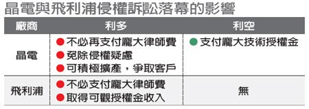 晶(jing)電(dian)強(qiang)調(tiao),官(guan)司(si)達(da)成(cheng)和(he)解(jie),主(zhu)要(yao)考(kao)慮(lv)與(yu)其(qi)支(zhi)付(fu)訴(su)訟(song)費(fei)用(yong),不(bu)如(ru)雙(shuang)方(fang)攜(xie)手(shou)合(he)作(zuo),使(shi)用(yong)飛(fei)利(li)浦(pu)的(de)專(zhuan)利(li)可(ke)改(gai)善(shan)晶(jing)電(dian)現(xian)有(you)產(chan)品(pin),並(bing)提(ti)升(sheng)未(wei)來(lai)產(chan)品(pin)表(biao)現(xian),客(ke)戶(hu)端(duan)采(cai)用(yong)時(shi)亦(yi)再(zai)無(wu)侵(qin)權(quan)疑(yi)慮(lv),整(zheng)體(ti)而(er)言(yan),絕(jue)對(dui)是(shi)利(li)益(yi)大(da)於(yu)授(shou)權(quan)條(tiao)件(jian)。