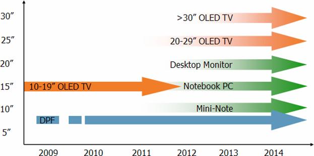 據DisplaySearch顯示技術研究總監Jennifer Colegrove表示,AMOLED麵板已成為高端電子產品突顯差異化的主要方式之ㄧ。同時該顯示技術不僅僅可應用於手機主屏,目前已逐步被應用在個人多媒體顯示裝置 (PMP)、數碼相機等。我們估計接下來3年全球將有大約20條新的或者舊線升級AMOLED生產線將會籌備完成。多數OLED廠商目標仍是希望生產大尺寸OLED TV,以LG Display為例,目前已順利量產小尺寸AMOLED麵板,同時宣布今年底要量產15寸電視機麵板。LG Electronics擬在今年底假期推出15寸OLED TV;然而Sony於2008年公布了20寸OLED TV之後,2009年尚未計劃推出20寸以上的OLED TV。