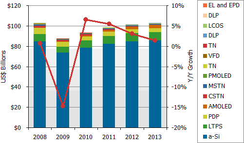 圖一 : 2008-2013全球平麵顯示器按不同技術別出貨金額預估與年成長率(單位:百萬美金)