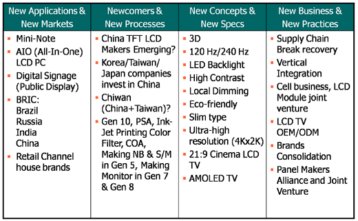 在接下來的十年將有八種因素主導著平麵顯示器的成長: 新應用與新市場、新廠商與新製程、新潮流與新規格、新商業模式與新實踐方式(如圖二)。其中有許多項目是來自於各平麵顯示器廠商在2008年底與2009年初這波景氣衰退中所得到的啟示;需求下滑與競爭日益激烈迫使廠商不斷的尋找新的策略、新的市場與新的解決方法,同時推動平麵顯示產業不斷地前進。