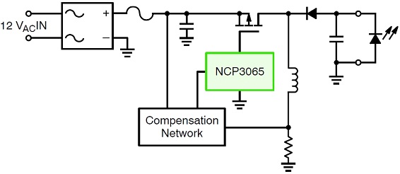 這參考設計的一項關鍵考慮因素,是在12 Vac輸入條件下,跨輸入線路變化及輸出電壓變化,實現平坦的電流穩流。這參考設計電路基於安森美半導體的NCP3065構建,工作頻率約為150 kHz,采用非隔離型配置。NCP3065是一款單片開關穩壓器,支持12 Vdc或12 Vac電源輸入,設計用於為HB-LED提供恒定電流。除了NCP3065,這參考設計還結合了自動檢測電路。這參考設計的功能框圖如圖1所示。