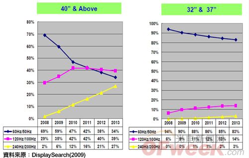 DisplaySearch預估,減少動態模糊(Motion Blur)、達成品牌區隔、消費者喜好及提高毛利率將為帶動120Hz、240Hz液晶麵板需求的主要動力,觀察32寸、37寸及40寸以上液晶麵板,50Hz/60Hz比重明顯下降;反之,120Hz/240Hz比例有上升趨勢,尤其在40寸以上最為明顯(如圖1)。