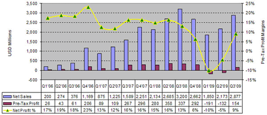 2009年證明了太陽能產業具有非常高的循環性變化,DisplaySearch觀察14個主要的太陽能電池Cell和模塊製造商的利潤率表現,2006年第一季度到2008年第四季的平均獲利可達15%,但2009年第一季則急劇下降到-10%,一直到2009年第二季尚呈現虧損。主要造成產業虧損的原因為西班牙再生能源回購費率(Feed-In-Tariff)的改變,全球經濟危機以及信貸緊縮造成需求緊縮等等。圖1為全球主要太陽能模塊廠商的合計營收,利潤和利潤率。