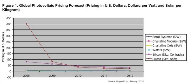 2009 年,光伏係統的平均價格下跌11%左右,而晶體矽組件的平均價格重挫了38%。iSuppli 公司預測,2010 年光伏係統的價格將下降10%,組件價格將再下跌20%。