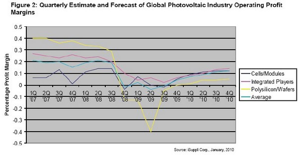 iSuppli 公司的分析結果顯示,繼2009 年大部分時間虧損之後,廠商在第四季度恢複盈利。預計2010 年獲利情況將繼續改善,但不會回升到經濟衰退之前的水平。iSuppli 公司預測,光伏產業多數領域的平均利潤率將在2010 年第四季度前回升到10%以上。但是,供應過剩的多晶矽領域的扭虧步伐將落在後麵。驅動降低成本計劃盈利情況改善的主要因素,是追上價格下跌的速度。