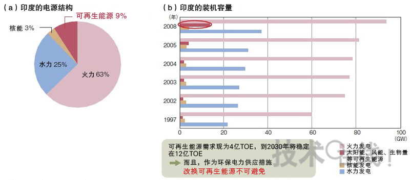 為了解決上麵不穩定的電力供應和環境問題,可再生能源成為了關注的焦點。民間調查機構的推測顯示,到2030年,印度對於可再生能源的需求將增加到現在4億TOE(石油換算噸)的3倍,達到12億TOE。