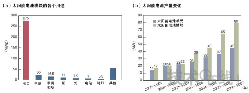 圖3:太陽能電池絕大多數出口在印度生產的太陽能電池模塊的用途中,出口占絕大多數。模塊和單元產量在2003年以後快速增加(b)。