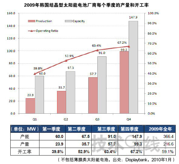 Displaybank稱cheng,韓han國guo廠chang商shang設she備bei開kai工gong率lv的de上shang升sheng,主zhu要yao得de益yi於yu以yi德de國guo為wei中zhong心xin的de歐ou洲zhou市shi場chang上shang太tai陽yang能neng電dian池chi需xu求qiu的de改gai善shan。不bu僅jin是shi設she備bei開kai工gong率lv,生sheng產chan能neng力li也ye得de到dao了le大da幅fu上shang升sheng。具ju體ti而er言yan,產chan能neng由you2009年第一季度的60MW,迅速攀升至2009年第四季度的147.9MW。Displaybank預測,如果今後繼續保持這一趨勢,2010年第一季度的開工率將提高至70%。