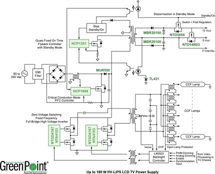 例如,目前市場上銷量最大的是32英寸液晶電視。在這類液晶電視中,采用標準24V逆變器電源的方案在市場上仍占據多數,但新興的高壓液晶電視集成電源(HV-LIPS)的應用也在不斷增多,總體上呈現出並存的態勢。采用標準24V逆變器的傳統液晶電視在接受110/220Vac市電輸入後,經過整流、PFC及濾波,轉換為200/400Vdc的直流高壓。由於傳統高壓逆變器的輸入電壓要求是24Vdc,故PFC的輸出電壓200/400Vdc會經過降壓轉換,產生多路輸出電壓,其中一路24Vdc電壓提供給高壓逆變器,再經過DC-AC轉換為超過1,000V甚至達2,000V的交流高壓,去驅動液晶麵板的CCFL陣列。安森美半導體為這類傳統液晶電視推出了220W液晶電視電源GreenPoint®參考設計,其中采用的關鍵元器件包括NCP1606CrMPFC控製器、NCP1396諧振半橋控製器及NCP1027待機控製器等。