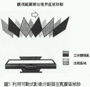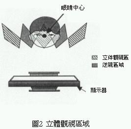 利li用yong這zhe種zhong原yuan理li可ke以yi針zhen對dui觀guan視shi者zhe觀guan賞shang畫hua麵mian時shi的de最zui適shi當dang位wei置zhi,除chu了le提ti供gong觀guan視shi者zhe左zuo右you兩liang眼yan影ying像xiang之zhi外wai,由you影ying像xiang正zheng麵mian的de顯xian示shi區qu到dao最zui適shi距ju離li所suo函han蓋gai的de區qu域yu,對dui觀guan視shi者zhe而er言yan就jiu變bian成cheng正zheng常chang的de立li體ti三san次ci元yuan影ying像xiang。不bu過guo兩liang眼yan視shi線xian相xiang鄰lin處chu的de影ying像xiang,會hui被bei左zuo、右(you)兩(liang)眼(yan)在(zai)無(wu)意(yi)識(shi)狀(zhuang)態(tai)下(xia)捕(bu)捉(zhuo)讀(du)取(qu)形(xing)成(cheng)所(suo)謂(wei)的(de)逆(ni)視(shi)領(ling)域(yu),換(huan)句(ju)話(hua)說(shuo)使(shi)用(yong)這(zhe)種(zhong)三(san)維(wei)立(li)體(ti)影(ying)像(xiang)分(fen)割(ge)器(qi)的(de)觀(guan)視(shi)者(zhe)必(bi)需(xu)固(gu)定(ding)在(zai)一(yi)定(ding)的(de)觀(guan)視(shi)位(wei)置(zhi)才(cai)能(neng)產(chan)生(sheng)立(li)體(ti)視(shi)覺(jiao)效(xiao)果(guo)(圖2)。