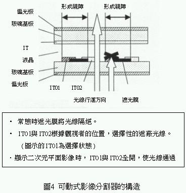 日本SANYO公司是最早從事有關三維立體影像技術的研究,早在94年曾推出不需專用眼鏡的三維立體影像分割器,利用這種影像分割器可用來觀賞立體動態影像,基本上它是根據視差障礙(parallaxbarrier)原理使影像交互排列先通過細長的縱列光柵後才由兩眼捕捉觀察,由於進入左、右眼的縱向影像因視差障礙器被分開,造成左、右眼所捕捉的影像產生微小偏離,最後經由視網膜當作三維影像讀取(圖1)。