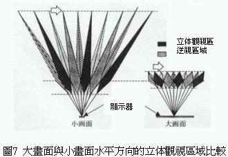傳統的不需專用眼鏡的三維立體影像顯示器,同樣水平方向時小畫麵的前後方向的立體可視範圍比大畫麵的立體可視範圍大(圖7),這是因為小畫麵的視角比較小,液晶顯示器與影像分割器較不容易產生所謂的moire幹涉縞。利用這種物理現象將液晶顯示器與影像分割器,藉由電子方式分割成16等份各別掌控專屬區域(圖8)