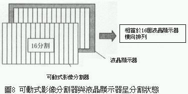 上述新型電子式影像分割器與液晶顯示器的控製方法與結構都非常簡單,因此它具有低價化的潛力。