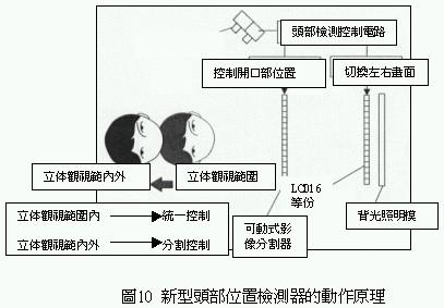 以往的顯示器立體觀視區以外的部位極易發生波紋、失真或局部逆視等問題,造成觀視者眼睛容易疲勞、不易觀賞立體影像等問題。上述新型電子式影像分割器與液晶顯示器,可以隨時監控觀視者的狀況,保持最適當的立體觀視位置。