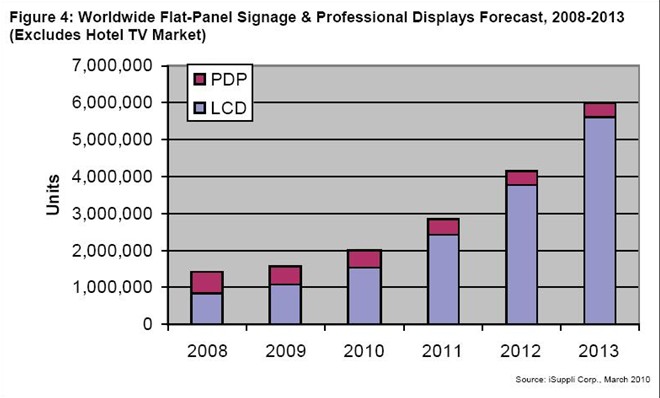 如圖所示為iSuppli公司對於平板標牌和專業顯示器的全球出貨量預測。該預測不包括酒店電視,因為有些人認為該領域不屬於這個市場。