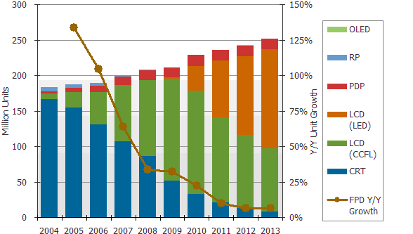圖一:2004-2013全球電視市場按不同技術出貨量與平麵電視年成長率(單位:百萬台)