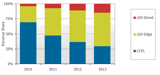 圖二 : 2010-2013 采CCFL與LED背光液晶電視按出貨金額計算市占率