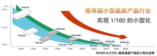 在水晶元器件的小型化方麵,大河晶振一直處於領先地位。公司在2008年開發的晶體FCX-07的體積與1989年開發的晶體FCX-01相比,實現了1/160的超小型化。RIVER ELETEC的技術開創了水晶元器件的新市場。