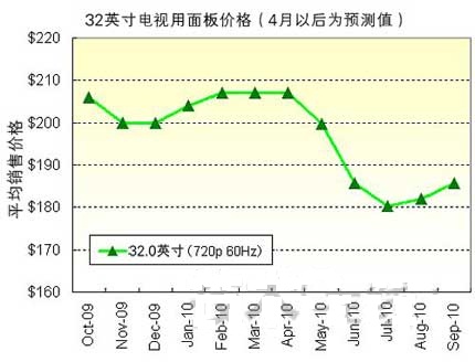 - 預計2010年第三季度32英寸用麵板價格為180~185美元左右
