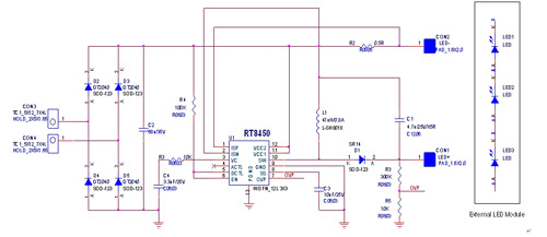 新款RT8450,可專門設計在MR16LED燈的驅動應用中,其內部電路設計架構可易於實現升降壓電路,如圖1所示。
