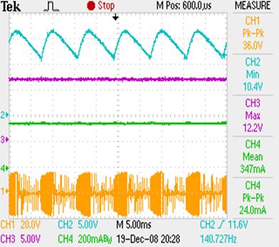 圖3:信道一為電子變壓器交流輸出電壓,信道二為經過整流及濾波後的輸入電壓,信道三為交流輸入電壓,信道四為LED輸出電流。