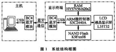 顯示終端由以ARM9微控製器S3C2440A為核心的嵌入式Linux平台加上BlueCore4藍牙模塊以及LCD液晶顯示屏組成。Linux操作係統安裝在NANDFLASH中,並連接了64MB的外擴RAM。由於S3C2440A接口比較豐富,所以係統硬件具有較好的擴展性能。