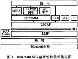 係統通過藍牙協議棧的RFCOMM協議層進行通信。RFCOMM協議提供串行數據傳輸,並能在2台藍牙設備之間同時維持多達60個連接,可以同時支持遺留串行端口應用程序以及其他應用程序中的OBEX協議。藍牙協議棧的結構框圖如圖2所示。