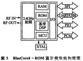 主機端和顯示終端都使用了CSR公司BlueCore4-ROM芯片組成的藍牙無線收發模塊。BlueCore4係列符合2.0版藍牙標準,並與現有1.1版和1.2版藍牙設備完全兼容。這裏采用的BlueCore4-ROM芯片具有很高的集成度,需要很少的外圍露件。它提供了UART、USB2.0等主機接口,並且提供了PCM音頻接口以及SPI接口。具有支持微微網和散射網,低功耗,和手機良好兼容,可以和802.11協議共存等優點。BlueCore4藍牙模塊結構如圖3所示。