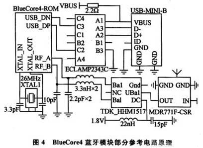 PC主機使用USB接口和BlueCore4藍牙模塊連接,對應的藍牙模塊同樣通過USB接口和S3C2440A的USB-HOST接口進行連接。USB接口具有即插即用的優點。通過Linux操作係統的支持,該模塊還可以使用通用的USB藍牙適配器替代。BlueCore4藍牙模塊部分參考電路原理如圖4所示。