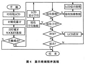 係統軟件同樣分為主機部分和顯示終端部分。這裏主要分析顯示終端部分軟件的設計,主機部分與其類似。顯示終端部分程序包括:LCD液晶屏初始化,藍牙設備的初始化,藍牙連接的建立和圖像字符數據的傳輸顯示等幾個部分。程序流程如圖6所示。