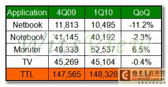- 2010年第一季全球大尺寸TFT-LCD麵板總出貨量增加至14,832萬片