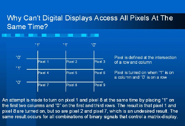由(you)於(yu)存(cun)在(zai)上(shang)述(shu)數(shu)位(wei)控(kong)製(zhi)的(de)問(wen)題(ti),畫(hua)素(su)級(ji)的(de)多(duo)線(xian)定(ding)址(zhi)方(fang)法(fa)一(yi)直(zhi)是(shi)類(lei)比(bi)式(shi)的(de)。影(ying)像(xiang)數(shu)據(ju)在(zai)處(chu)理(li)器(qi)中(zhong)仍(reng)以(yi)數(shu)位(wei)方(fang)式(shi)處(chu)理(li),但(dan)採(採)用(yong)影(ying)像(xiang)分(fen)解(jie)方(fang)法(fa)將(jiang)影(ying)像(xiang)分(fen)解(jie)成(cheng)行(xing)列(lie)數(shu)據(ju),然(ran)後(hou)再(zai)以(yi)數(shu)位(wei)類(lei)比(bi)轉(zhuan)換(huan)器(qi)(DAC)轉換成類比訊號。類比的行與列訊號通常是OFDM載波,而行與列訊號中的每個頻率元件代表顯示器中單一畫素的控製。