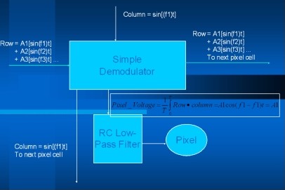 每個行列訊號的交叉點映射每個畫素的頻率控製(每列訊號具有相同的頻率,但每行訊號的頻率不同)。每個畫素包含一個簡單的解調電路,能夠解調輸入的行列訊號,而產生一個可控製畫素亮度的訊號振幅(圖2)。如此一來,所有的畫素就能夠同時加以控製,並且表現出不同的亮度。