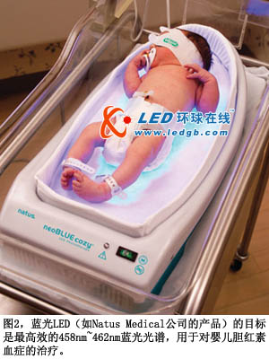 所幸,光療通常對此種病症有效果,因為膽紅素會吸收藍光,分解為水溶形式而排出體外(圖2)。458nm~462nm區(qu)域(yu)中(zhong)的(de)窄(zhai)帶(dai)藍(lan)光(guang)最(zui)有(you)效(xiao)。過(guo)去(qu),膽(dan)紅(hong)素(su)治(zhi)療(liao)光(guang)線(xian)都(dou)采(cai)用(yong)定(ding)製(zhi)的(de)藍(lan)色(se)熒(ying)光(guang)燈(deng)管(guan)和(he)彩(cai)色(se)過(guo)濾(lv)器(qi)。但(dan)是(shi),熒(ying)光(guang)燈(deng)的(de)光(guang)譜(pu)相(xiang)對(dui)較(jiao)寬(kuan)。盡(jin)管(guan)其(qi)分(fen)布(bu)中(zhong)心(xin)位(wei)於(yu)所(suo)需(xu)波(bo)長(chang)上(shang),但(dan)光(guang)譜(pu)分(fen)布(bu)在(zai)兩(liang)端(duan)下(xia)降(jiang),表(biao)示(shi)能(neng)破(po)壞(huai)膽(dan)紅(hong)素(su)的(de)光(guang)能(neng)量(liang)下(xia)降(jiang),因(yin)此(ci)治(zhi)療(liao)時(shi)間(jian)將(jiang)延(yan)長(chang)。與(yu)之(zhi)相(xiang)比(bi),藍(lan)光(guang)LED膽紅素光源可以有正確的頻率,幾乎不浪費光能量。另外,LED的膽紅素光源有機械穩定特性,更長的壽命,也比熒光設備低廉。在未來,光線療法將能通過“發光服”提供光照,提供比光箱更有效的治療方法。