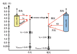 未來,新型鋰離子電池和LED技術將會為LED驅動帶來新的挑戰。配合最新的化學成果,電池電壓的範圍將擴大到2.3~4.7V,而典型的白光LED正向電壓將會下降至2.9V。與此同時,輸出驅動器的飽和電壓都會隨著下降。當采用並聯驅動時,要高效地驅動一個2.9V的LED,就需要動用一個升降壓轉換器。圖2所示為由電池、驅動器和LED技術的進步所帶來的效果。