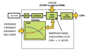 使用RGB背光時,當LED溫度改變時,驅動器必須更正紅、綠(lv)和(he)藍(lan)三(san)主(zhu)色(se)間(jian)的(de)亮(liang)度(du)平(ping)衡(heng),以(yi)防(fang)出(chu)現(xian)白(bai)點(dian)位(wei)移(yi)。此(ci)外(wai),還(hai)需(xu)保(bao)證(zheng)驅(qu)動(dong)器(qi)在(zai)任(ren)何(he)操(cao)作(zuo)溫(wen)度(du)下(xia)維(wei)持(chi)光(guang)的(de)正(zheng)確(que)強(qiang)度(du)。而(er)在(zai)補(bu)償(chang)方(fang)麵(mian),可(ke)以(yi)用(yong)閉(bi)環(huan)或(huo)開(kai)環(huan)形(xing)式(shi)。若(ruo)使(shi)用(yong)閉(bi)環(huan)補(bu)償(chang),便(bian)需(xu)采(cai)用(yong)感(gan)光(guang)器(qi)來(lai)測(ce)量(liang)白(bai)點(dian)和(he)其(qi)強(qiang)度(du)。相(xiang)反(fan)地(di),如(ru)使(shi)用(yong)開(kai)環(huan)補(bu)償(chang),那(na)溫(wen)度(du)便(bian)需(xu)事(shi)先(xian)量(liang)度(du)出(chu)來(lai),並(bing)通(tong)過(guo)預(yu)先(xian)定(ding)義(yi)好(hao)的(de)補(bu)償(chang)曲(qu)線(xian)來(lai)調(tiao)節(jie)亮(liang)度(du)的(de)平(ping)衡(heng)。