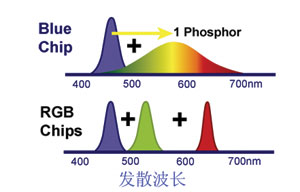 圖3典型白光LED與RGBLED光譜的比較