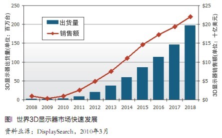市場研究公司DisplaySearch日前發表一份專門報告稱,在3D電影成功的促動下,3D顯示器市場將於2010年開始起飛,預測3D顯示器出貨量將從2008年的70萬個增長到2018年的1.96億個,10年內年均增長率達75%,同期銷售額從9億美元增長到220億美元,年均增長率38%(圖1)。世界消費電子廠商將隨著推出一批3D有關產品,包括電視機、監視器、筆記本電腦、藍光盤播放器、數碼相機、攝像機、相框等進軍家庭市場。加上立體顯示原來就有的醫療等專業應用以及廣告、公共顯示牌等應用,都會成為促動顯示產業開始從平板產品向著3D大進軍,這也是一次從平板顯示轉向立體顯示的革命。