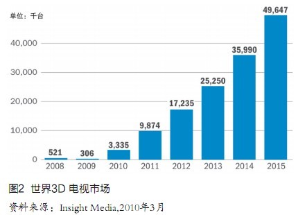 Insight Media市場研究公司3月發表的最新報告更加樂觀,預測世界3D電視市場將從今年的340萬台飆升到2015年的4965萬台,增長10倍還多(圖2),屆時占有率將超過20%。其對手公司iSupp1i公司尤其樂觀,認為同期世界3D電視市場將從420萬台竄升到7800萬台,占有率達40%,銷售額644億美元。