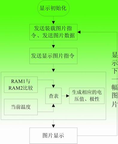 APOLLO驅動電子紙顯示的操作流程如圖4所suo示shi。電dian子zi紙zhi的de顯xian示shi依yi據ju是shi要yao顯xian示shi的de圖tu片pian與yu當dang前qian顯xian示shi圖tu片pian相xiang比bi較jiao,得de出chu其qi差cha值zhi,再zai根gen據ju當dang前qian溫wen度du查zha詢xun對dui應ying的de數shu據ju表biao格ge,依yi相xiang應ying數shu據ju輸shu出chu驅qu動dong。因yin此ci在zai上shang電dian後hou需xu對dui電dian子zi紙zhi進jin行xing顯xian示shi初chu始shi化hua,這zhe樣yang後hou續xu的de圖tu片pian顯xian示shi就jiu有you較jiao好hao的de基ji準zhun值zhi。顯xian示shi初chu始shi化hua後houRAM1數據全置為1,第一幅圖片數據存於RAM2,顯示第一幅圖片時將RAM2與RAM1進行比對,查表顯示輸出;第二幅圖片數據存於RAM1,顯示第二幅圖片時將RAM1與RAM2(存儲當前圖片)進行比對,查表顯示輸出,RAM1即存儲當前圖片;下一幅要顯示的圖片存儲於RAM2中,依次類推,循環執行即可輸出要顯示的畫麵。